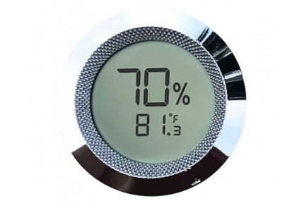 The HYDIG300 series possesses a round shape with a bold appearance featuring a high polished silver finish and textured inner bezel. Includes an on-board calibration feature to adjust your display as needed. Temperature and relative humidity are displayed through an easy to read gauge. Switch temperature read-out between Celsius and Fahrenheit. Makes keeping tabs on humidity levels easy! Includes a battery and double sided velcro set for easy mounting to the interior of any cigar humidor or other surface.Easy to Read Display