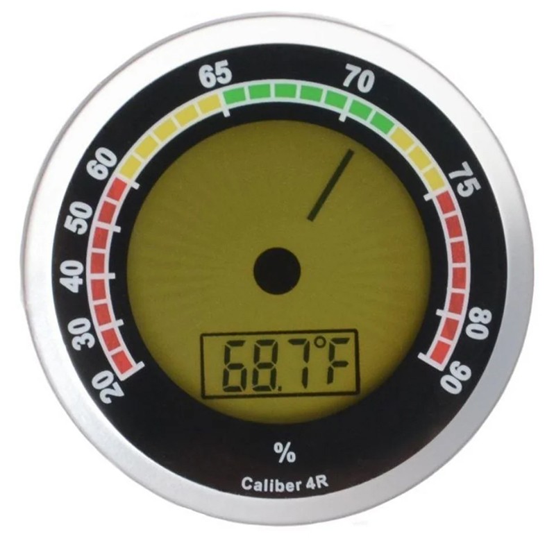 This round digital hygrometer is a fabulous looking piece! Humidity is displayed through 2 readouts including a digital analog needle coupled with a digital numeric interface. This entirely unique design combines a black face, beautiful silver frame and a multi-colored humidity gauge for easy monitoring. Displays current temperature in Celsius or Fahrenheit and relative humidity percentage. Records minimum and maximum values and includes a calibration feature which allows you to adjust the displayed humidity value for accuracy . Includes a battery and a double faced magnet for clean and easy mounting.