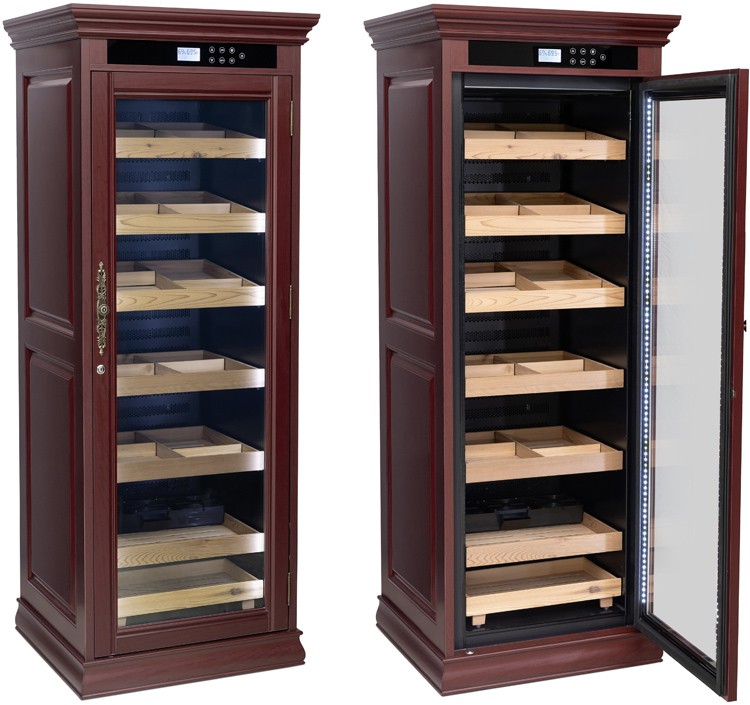 The esteemed Remington cigar cabinet is the finest in electronically controlled humidors on the market today. This unit has got to be one of the most luxurious pieces of cigar furniture we have got our hands on to date. Every inch of this cabinet is done right. From its solid hardwood construction to its rich dark cherry finish; from its embossed wood side panels to its distinguished crown molding accents, the Remington cabinet humidor is a superb example of fine cabinetry craftsmanship. One of the most prominent features of this unit is its electronically adjustable climate control. Relative humidity and ambient temperature can be set and monitored through its touch screen control panel allowing it to maintain up to 2250 cigars. The settings are automatically saved to memory so that your smokes are always kept in the optimum environment. Built-in display panel icons illuminate indicating when the unit is engaged in heating, cooling and humidification modes. A de-mist feature that helps maintain the glass free of condensation along with pure white LED interior lighting are also both controlled from the panel. The tempered glass door possesses an exceptional heavy duty seal and a solid weight and feel. Opening the door reveals 6 drawer style shelves on metal slides for smooth operation. The top 3 shelves are set on an angle for improved viewing and the bottom 3 are set flat. Each shelf has 3 adjustable dividers. At the interior base just behind the standalone tray there is a ledge that holds a removable 1/2 gallon refillable water reservoir with a built-in auxiliary fan that provides moisture to the entire cabinet. The water reservoir can also be re-located and set into a slotted recess in the lowest sliding tray for easy access. Each sliding tray shelf is adjustable and removable. Accommodates individual cigars and entire cigar box storage. No maintenance - No assembly - No water lines required. Simply plug the Remington into any 110/120v outlet, fill the water reservoir through the fill spout, load in your cigars, adjust your climate settings and you are ready to go! The cabinet comes full assembled in a factory sealed box. Easy start instructions and a lock and key set are included. The Remington Cabinet Humidor provides the cigar aficionado with the ultimate in cigar preservation at an amazing price! (220/240v option available, please contact us for lead time and shipping quote)
