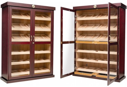 The Bateman Cabinet Humidor features an enormous capacity making it one of the largest cabinet humidor in our line-up. It's clean lines and bold design make this cigar enclosure an outstanding furniture addition that can fit into virtually any decor at an affordable price. This humidor features a beautiful dark cherry wood finish on its exterior with a solid spanish cedar interior. The exterior features include dual full length glass doors secured with a lock and key set. Humidity levels can be monitored through the Bateman's built-in external hygrometer with calibration feature. The humidor also includes 24 large humidifiers to sustain consistent humidity levels. These humidifiers are set inside 4 pull out drawers which are located in the center and bottom portions of the unit which can also house accessories like lighters, cutters and ashtrays. The Bateman Cabinet humidor has a humongous capacity with a spacious interior that can display up to 4000 cigars for flat or angled storage! This unit is designed to include 12 extra large removable spanish cedar trays with 2 adjustable dividers in each. Each tray is supported by a cedar shelf. At your option, these trays can be removed from the unit and boxes of cigars can be merchandised for display directly on the shelves. Models like this cabinet can be found in stores priced between $2500-$3000! The Bateman Cabinet Humidor provides its owner with the ultimate in cigar storage with the characteristics of fine furniture that will enhance any decor at a fantastic sale price! LED LIGHTING OPTION AVAILABLE – Click "Customize & Buy" & on "Click for Info" next to the LED option for details.