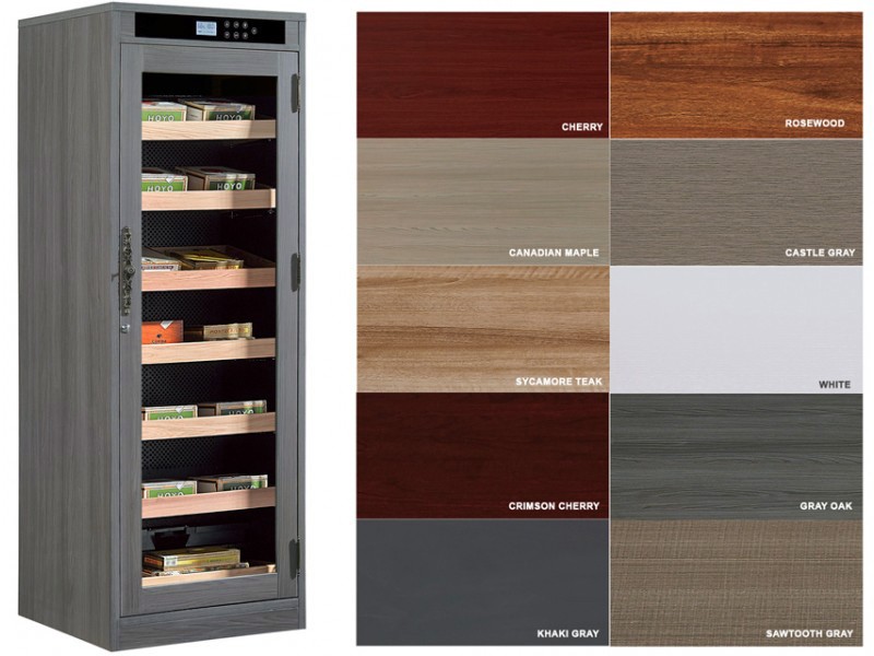 The esteemed Remington Lite Custom Finish Cigar Cabinet is the finest in electronically controlled humidors on the market today. This unit has got to be one of the most luxurious pieces of cigar furniture we have got our hands on to date. Every inch of this cabinet is done right. From its rich finish to its crisp modern contemporary design, the Remington Lite cabinet humidor is a superb example of fine cabinetry craftsmanship. One of the most prominent features of this unit is its electronically adjustable climate control. Relative humidity and ambient temperature can be set and monitored through its push button control panel allowing it to maintain up to 2250 cigars. The settings are automatically saved to memory so that your smokes are always kept in the optimum environment. Built-in display panel icons illuminate indicating when the unit is engaged in heating, cooling and humidification modes. A de-mist feature that helps maintain the glass free of condensation along with pure white LED interior lighting are also both controlled from the panel. The tempered glass door possesses an exceptional heavy duty seal and a solid weight and feel. Opening the door reveals 6 drawer style shelves on metal slides for smooth operation. The top 3 shelves are set on an angle for improved viewing and the bottom 3 are set flat. Each shelf has 3 adjustable dividers. At the interior base just behind the standalone tray there is a ledge that holds a removable 1/2 gallon refillable water reservoir with a built-in auxiliary fan that provides moisture to the entire cabinet. The water reservoir can also be re-located and set into a slotted recess in the lowest sliding tray for easy access. Each sliding shelf is adjustable and removable. Accommodates individual cigar and entire cigar box storage. No maintenance - No assembly - No water lines required. Simply plug the Remington Lite into any 110/120v outlet, fill the water reservoir through the fill spout, load in your cigars, adjust your climate settings and you are ready to go! The cabinet comes full assembled in a factory sealed box. Easy start instructions and a lock and key set are included. The Remington Lite Custom Finish Cabinet Humidor provides the cigar aficionado with the ultimate in cigar preservation at an amazing price! (220/240v option available, please contact us for lead time and shipping quote)