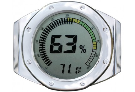 This new to market watch bezel style silver digital hygrometer is something you don't see every day! The watch bezel and case are done in a stunning silver chrome reflective finish throughout and looks fantastic in person. Features rivet style screw detailing around the edge of its bezel, a multi-colored easy to read gauge and a calibration feature to adjust displayed humidity values for improved accuracy. Minimum and maximum temperature and humidity values are recorded and stored to memory so you can easily keep tabs on your environment. Cigar lovers can monitor their smokes through this hygrometer's digital display! Relative humidity and temperature are clearly shown through an easy to read screen. Toggle between current temperature in Celsius or Fahrenheit. Includes a battery and mounting magnet set to secure to the interior of your humidor. This unit has been a hit the instant we introduced it. Pick one up and see for yourself!Totally Unique "Watch Style" Design in a Silver Chrome Finish