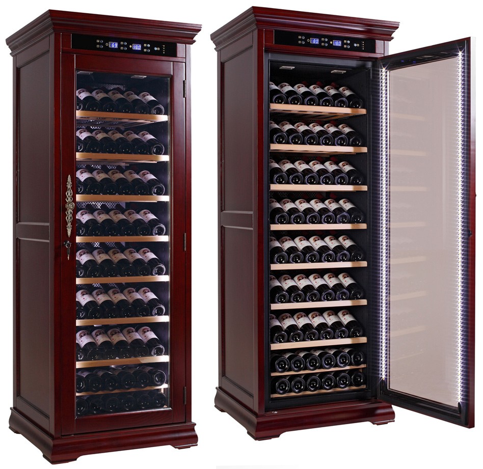 The Rochester wine cabinet is the epitome of elegance in luxury wine furniture. Every detail from head to toe in this cabinet is done right. From its rich dark cherry finish to its solid hardwood construction; from its distinguished crown molding appointments to its embossed wooden side panels, the Rochester cabinet is a magnificent example of fine furniture craftsmanship. One of the notable features of this unit is its user adjustable electronic climate control. Ambient temperature and relative humidity can be set and monitored through its easy to use control panel. The settings are automatically saved to memory so that up to 146 bottles of your favorite wine are kept in the perfect environment. On-board display color coded LED lights indicate when the unit is engaged in cooling, heating and humidification modes. Features a pure white interior LED lighting system and an on-board defrost mechanism to keep the glass door free of condensation. The solid weight tempered glass door carries a heavy duty seal and protects 8 drawer style bottle shelves with built-in metal slides for smooth operation. The top 7 shelves are set on an angle for improved viewing and the bottom level is set flat. Removing the shelves allows for even more storage. Each sliding shelf is adjustable and removable. No assembly, maintenance or water lines required. Simply connect the Rochester to any 110/120v outlet, load in your bottles, choose your climate settings and you are ready to go! The cabinet comes fully assembled in a factory sealed box and includes an easy to follow operating manual and a lock and key set. The Rochester cabinet provides the wine aficionado with the ultimate in wine preservation at an amazing price!